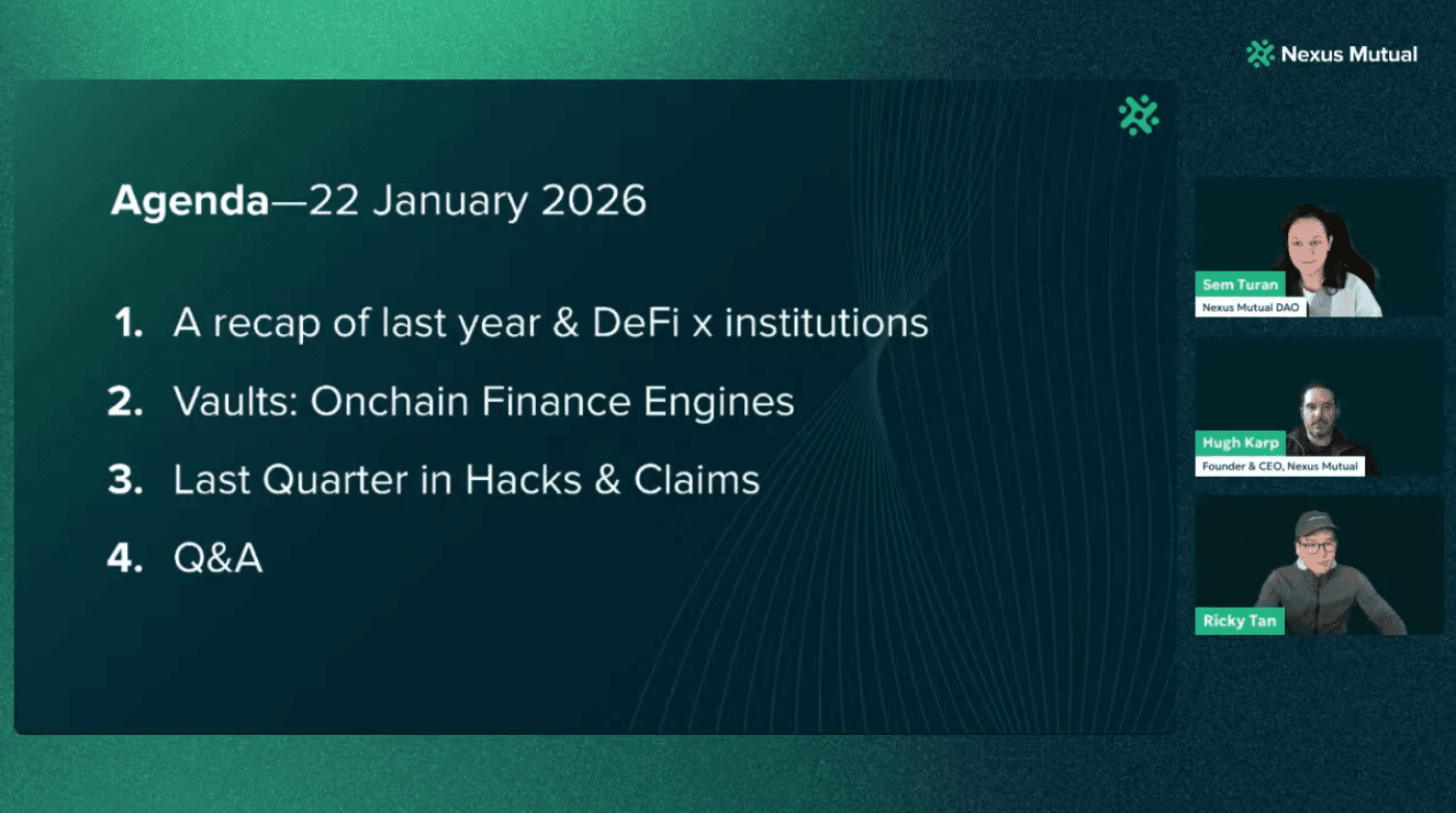 ↑ Watch the DeFi Risk Briefing — Jan 2026: Institutions, Vaults, Hacks & Claims recording on YouTube